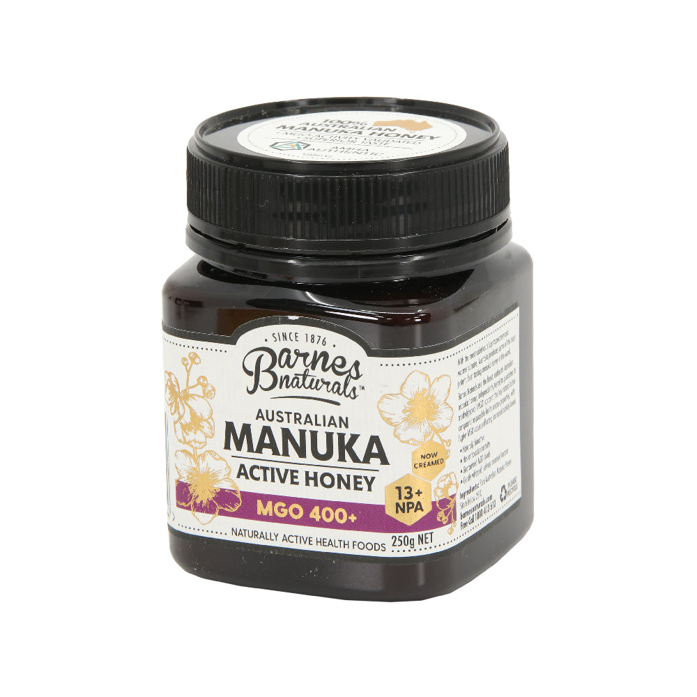 Extensively researched, manuka honey is recognised worldwide for its special active properties. Australia produces some of the most active and best tasting manuka honey in the world due to our warmer climate and number of Leptospermum varieties.With over 140 year of expertise in honey, Barnes Naturals uses only the finest, authentic Australian manuka honey, independently tested to guarantee its methylglyoxal (MGO) content. MGO is the key natural active compound responsible for the unique properties of manuka honey, with higher MGO values reflecting increased activity levels.