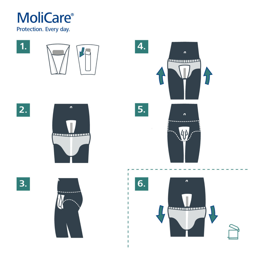 Brand: MoliCare® Premium Men Pad Type: Pouch Pads for men with light incontinence Droplets: 2 drops Quantity: 14 pieces Description: • Specially designed for Men • Active Skin Protection pH 5.5 to maintain healthy skin by potentially preventing or treating dermatitis • Quick dry system to securly lock-in wetness also under pressure and weight • Soft three layers absorbent core guides fluids quickly into its center, locking both urine and odor safely inside • Easily fixed with underwear using the adhesive strip • Dermatologically tested materials minimize the risk for allergic reactions • Made in Germany Anatomically shaped pouch for men suffering from very light bladder weakness. Can be worn with regular underwear providing discreet and secure feeling. Small packaging allows the product to be brought when travelling. Recommended use with MoliCare® Fixpants Code: 168600 For more information please visit: www.hartmann.info |