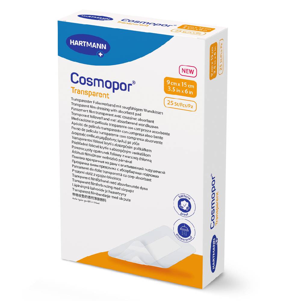 Cosmopor® Transparent is a sterile, self-adhesive transparent wound dressing with a low adherent absorbent pad, suitable for post-operative care of slightly exuding wounds. Cosmopor® Transparent offers protection against bacterial penetration and is ideal for use as a sterile dressing for minor injuries.